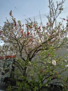 1本の木にピンクと赤の桜の花が咲いていましたので